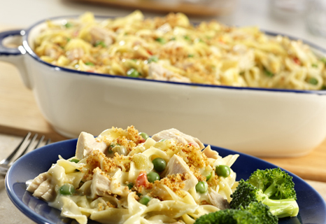 - Heat the oven to 400°F. Stir the soup, milk, peas, pimientos, if desired, tuna and noodles in a 1 1/2-quart baking dish. Stir the bread crumbs and butter in a small bowl.